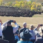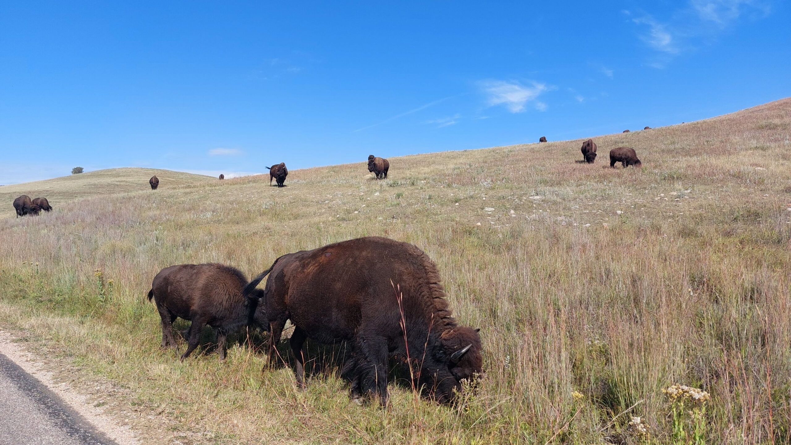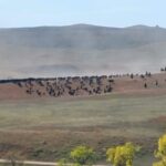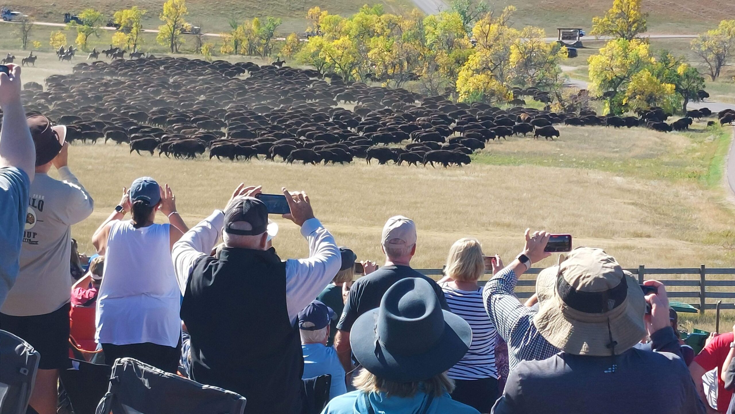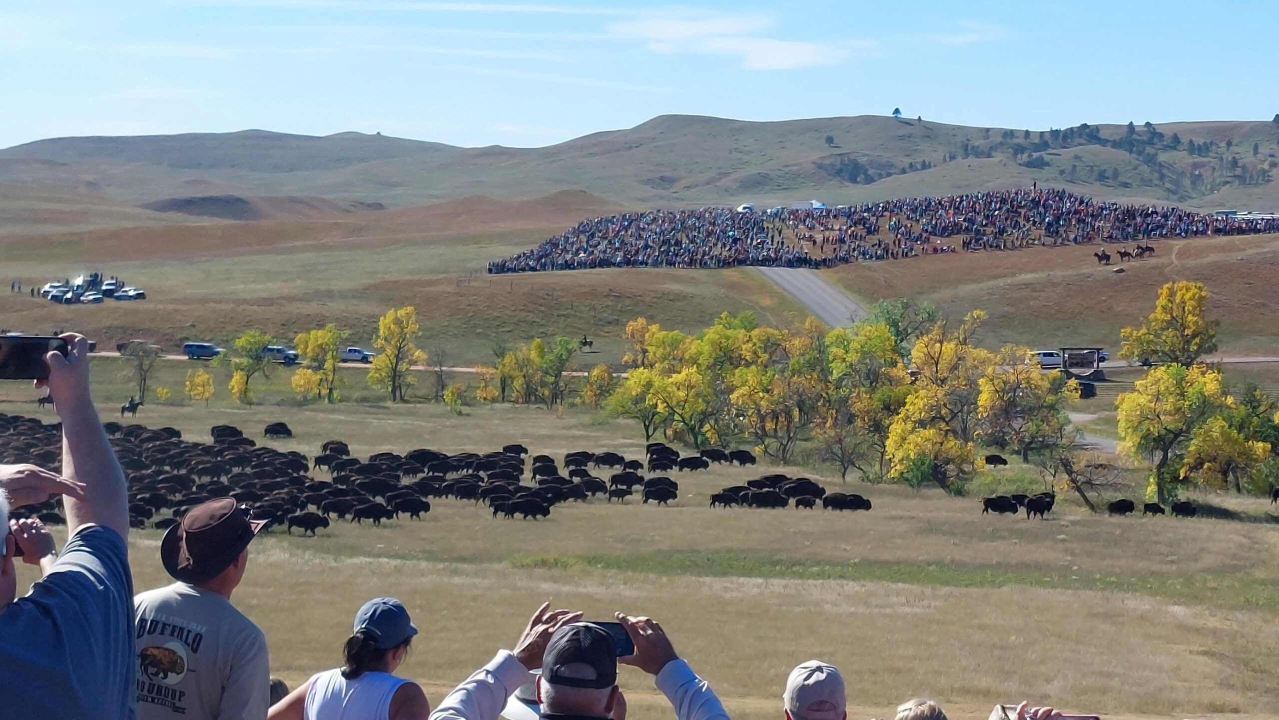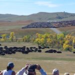 This campground is about 7 miles from Custer State Park. This week we drove Needles Highway which provides some great views of Mt. Rushmore. Also the rock formations along Needles Hwy is very unique and is gave the name to the highway. On Thursday they kicked of the Art Festival within Custer State Park where local Artists showed their Art. Lots of nice crafts could be seen. Friday morning we headed out early (6AM) to watch the yearly Buffalo Roundup. 20 – 25,000 visitors show up to watch this event. At about 11AM the Buffalo (850-1300) came over a hill and the drivers (Cowboys???) drove them towards the big corral where they got penned up for counting, health check, vaccination and pregnancy tests. The event was over at 11:45 and the madness of thousands of cars leaving the park started. We made it back to our campground (maybe 20 miles) at 2:30PM. This is a once in a lifetime visit for us and we enjoyed it a lot. Saturday was R&R (Rest and Relax)Day. Sunday we packed up and continued our trek to the east.